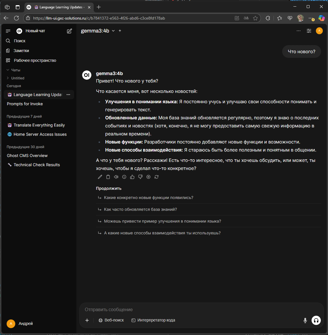 В целом если вы планируете использовать Ollama локально, этого вполне достаточно что бы запустить некоторые инструменты, о которых мы поговорим далее в статье. Моей целью же было, настроить Ollama сервер доступный из сети, что бы иметь возможность использовать его с любого устройства, а так же развернуть Open Web UI для привычного взаимодействия с языковыми моделями, как с ChatGPT.
