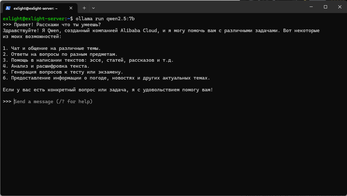 Установка Ollama довольно проста как на Linux, так и на Windows системах и не требует особых навыков. Что бы установить Ollama на свой Linux сервер, потребовалось всего-навсего запустить скрипт: curl -fsSL https://ollama.com/install.sh | sh